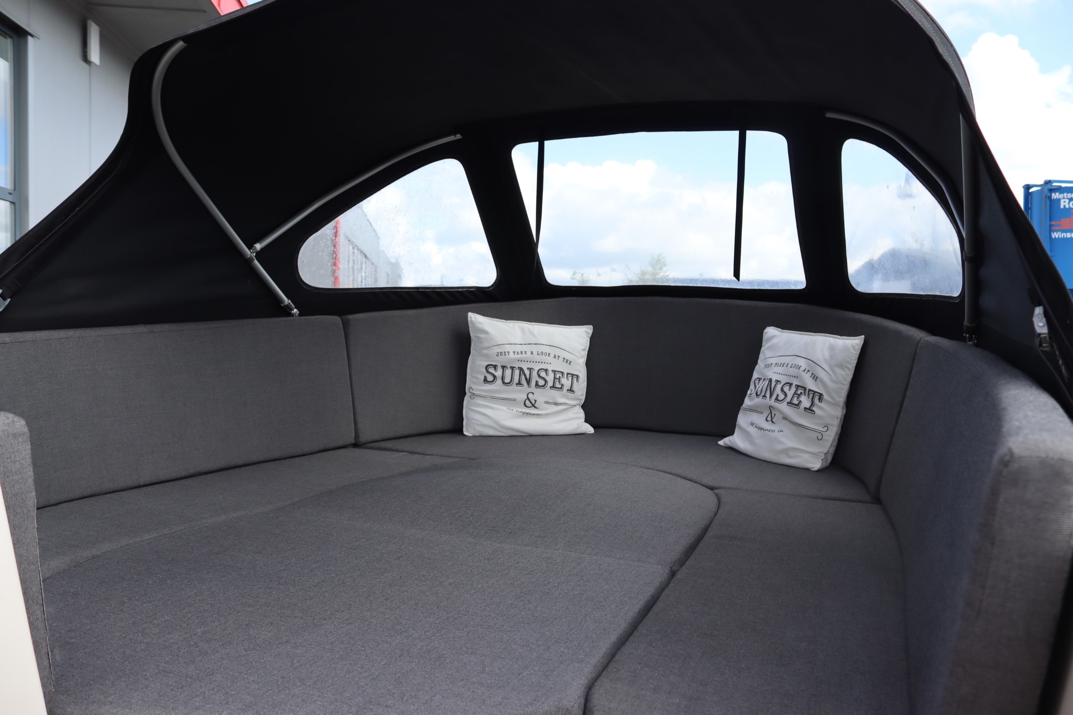 Cabrioverdeck mit Plane, um den 530 XL komplett wasserdicht an Land verschließen zu können. Klappbares Verdeck, um während des Segelns geschützt zu sein. Set besteht aus hochwertigem Stoff, Aluminiumrahmen und Plane.
