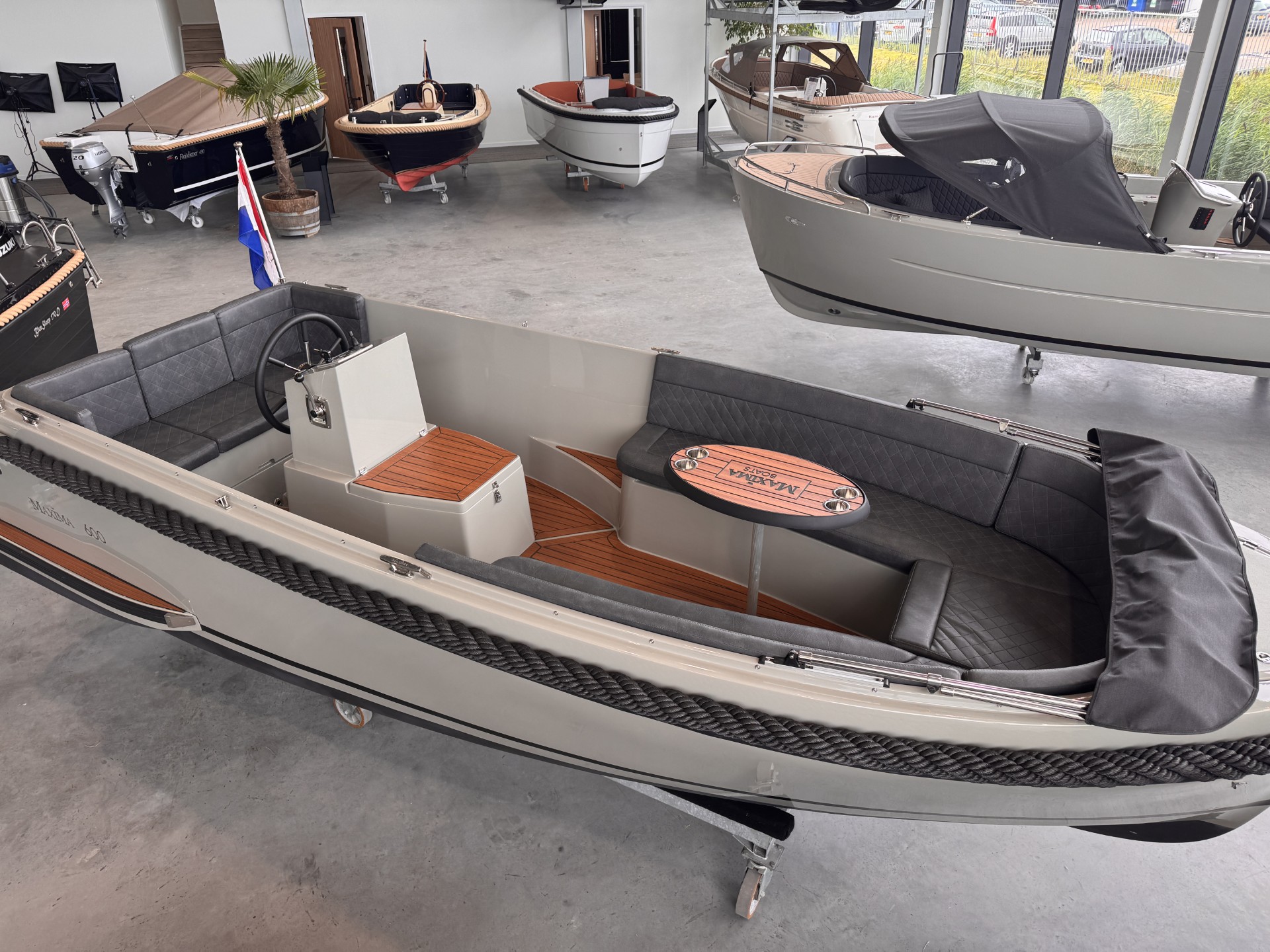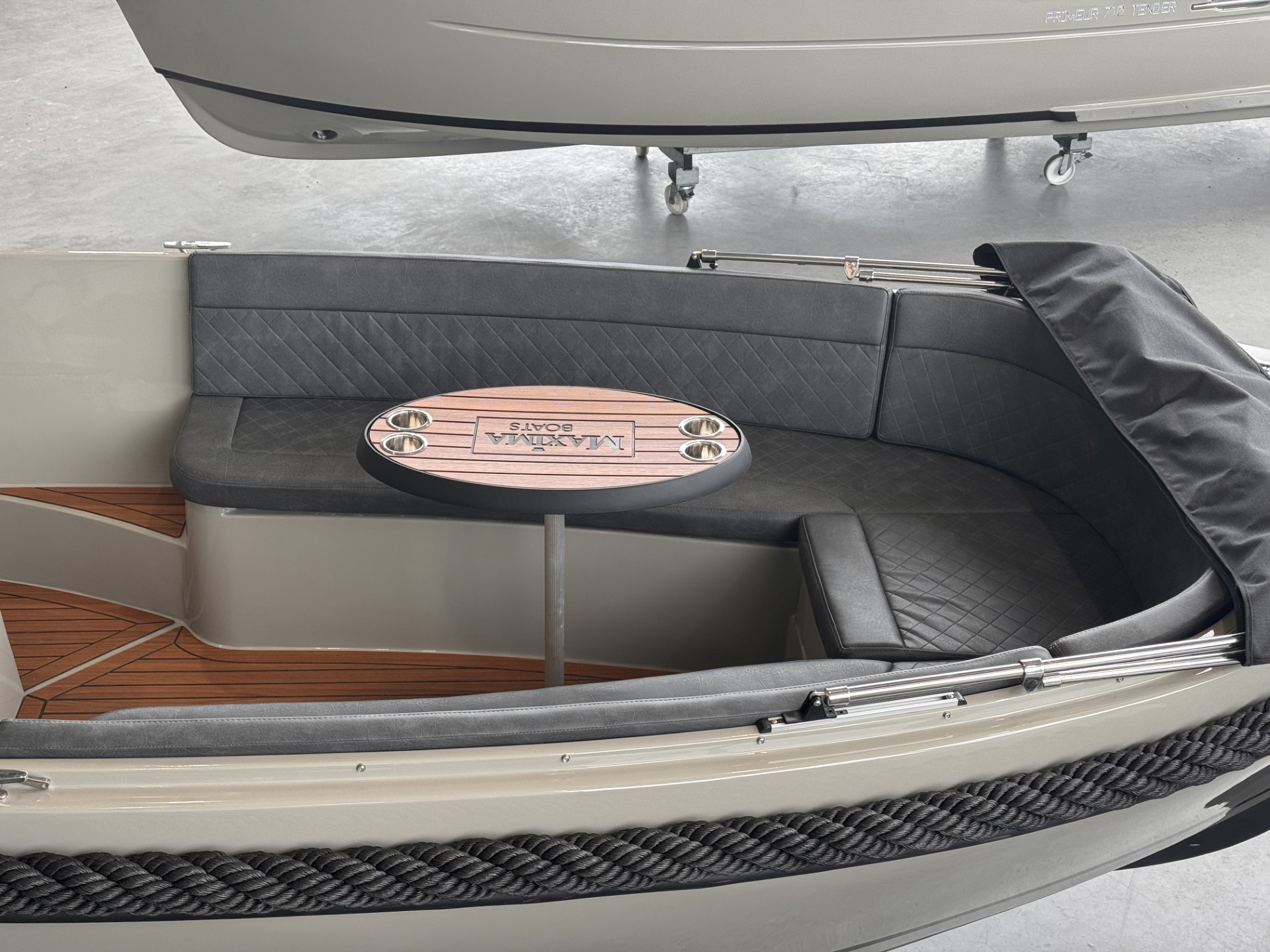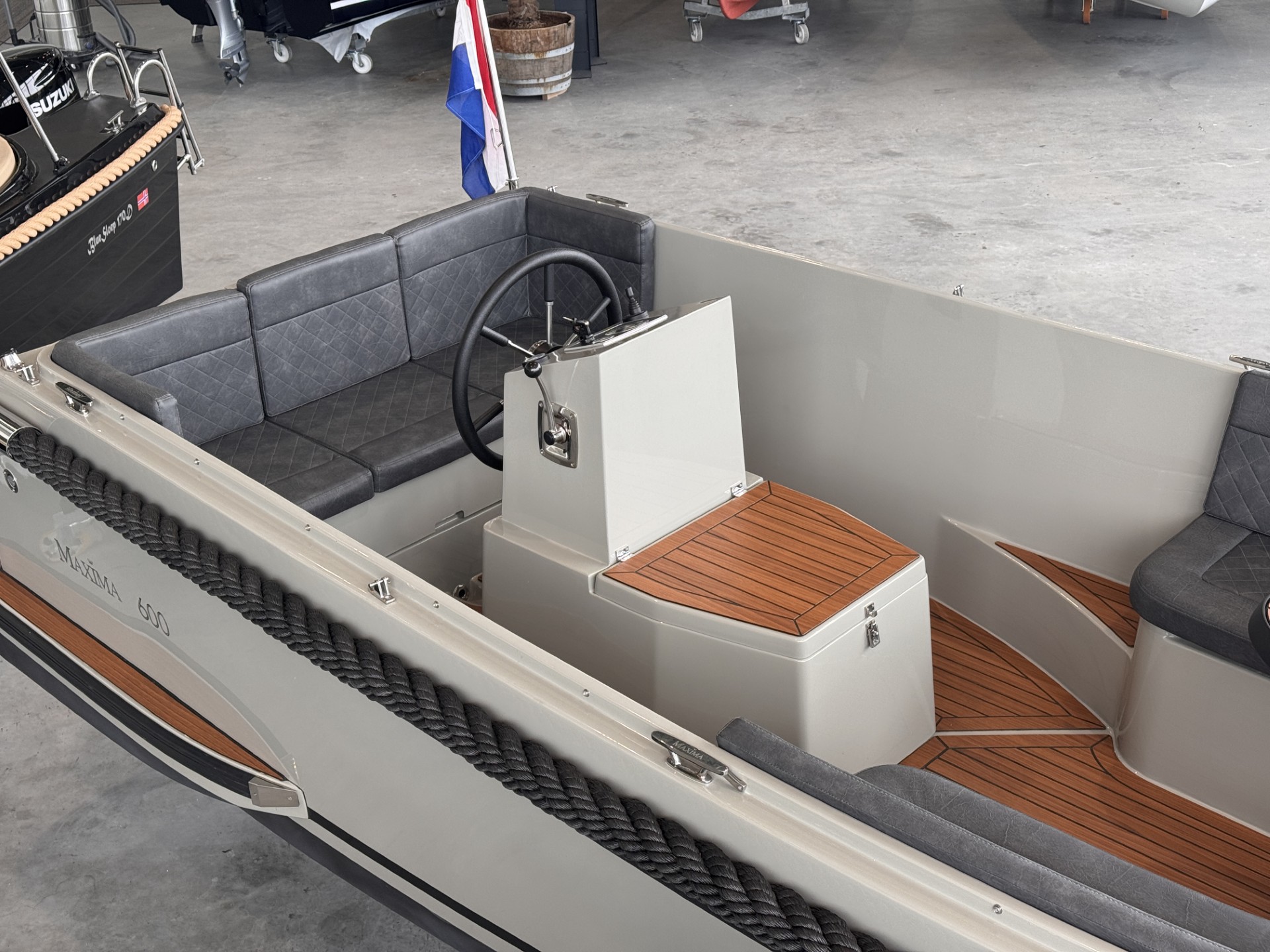 Met een lengte van 6 meter en een breedte van 2,25 meter biedt deze Maxima 600 ruimte aan 6 tot 8 personen. De diepe kuip met een comfortabele rondzit, luxe Markilux kussenset en een aparte 3-persoons achterbank biedt veel zit- en leefruimte aan boord. De praktische achterinstap met deurtje en het zwemplateau zorgen voor eenvoudig in- en uitstappen. De motorruimte is geïsoleerd, waardoor het motorgeluid tot een minimum wordt beperkt. De kuip is bovendien zelflozend.