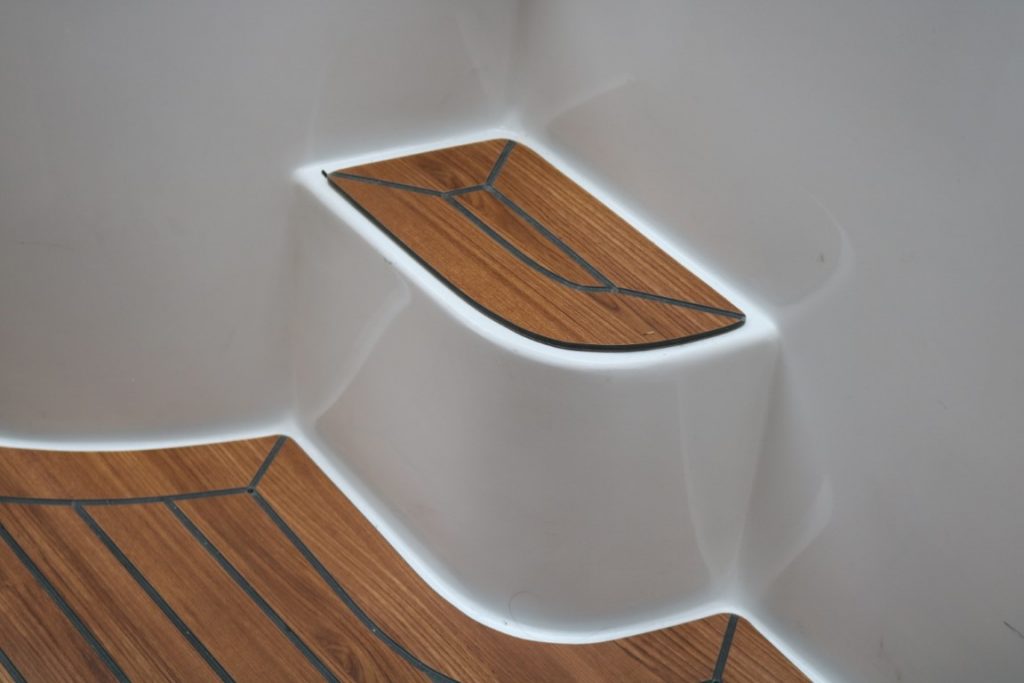 Onderhoudsvrije teakvloer om de 570 Tender een persoonlijke touch te geven. Inclusief teak op instaptredes.